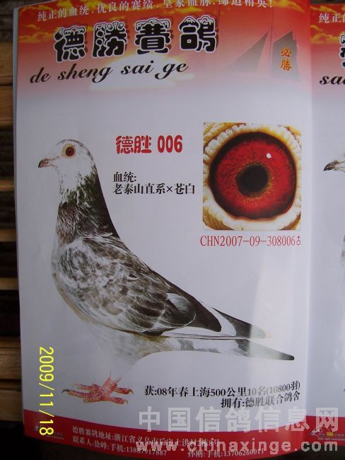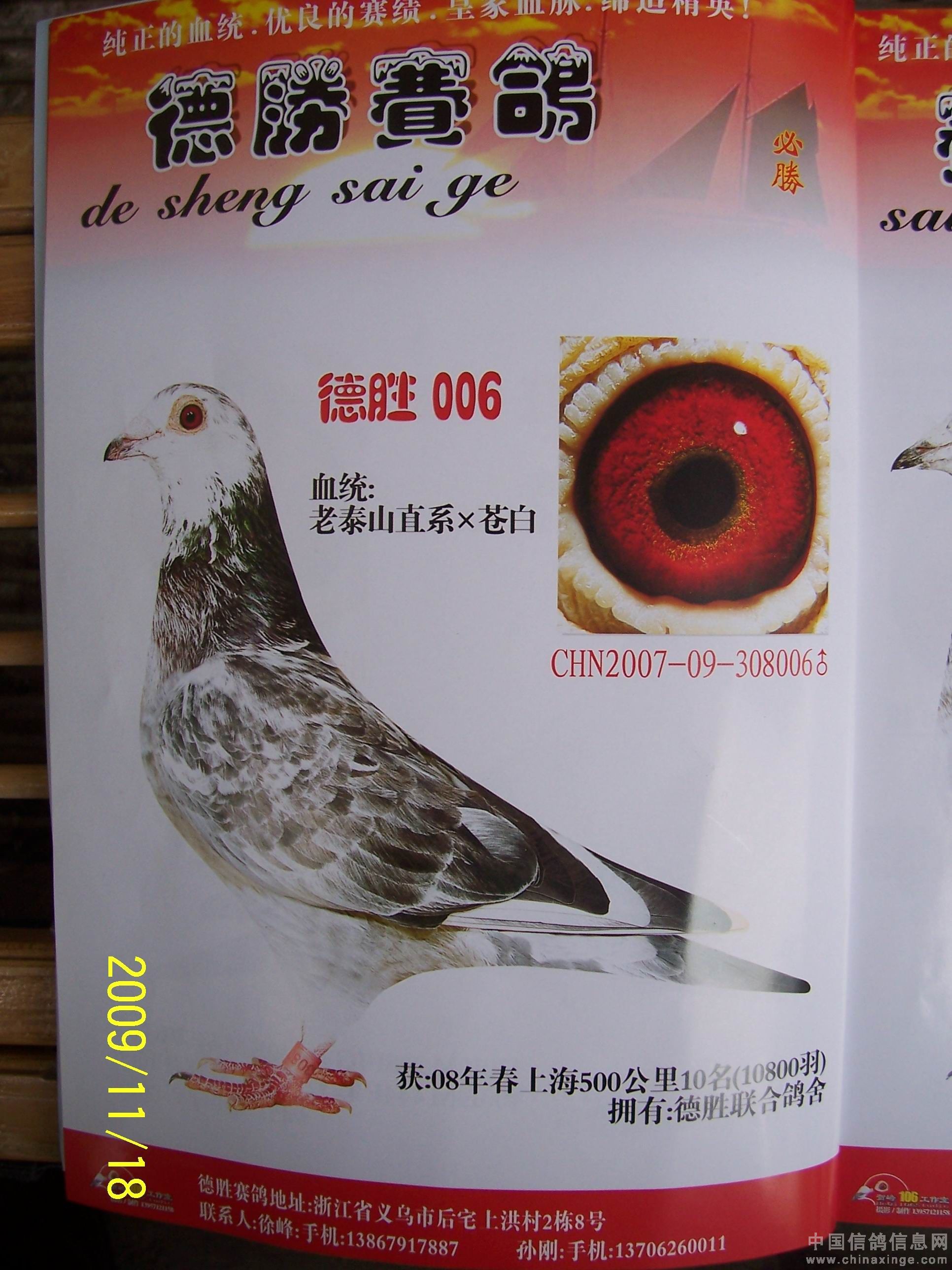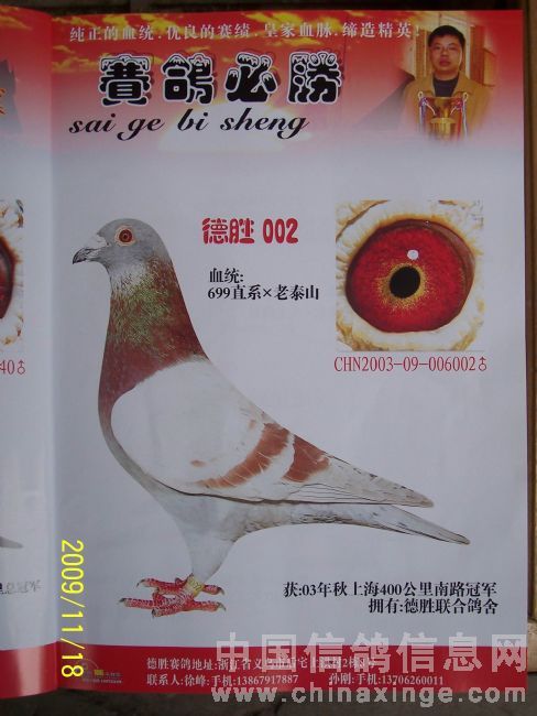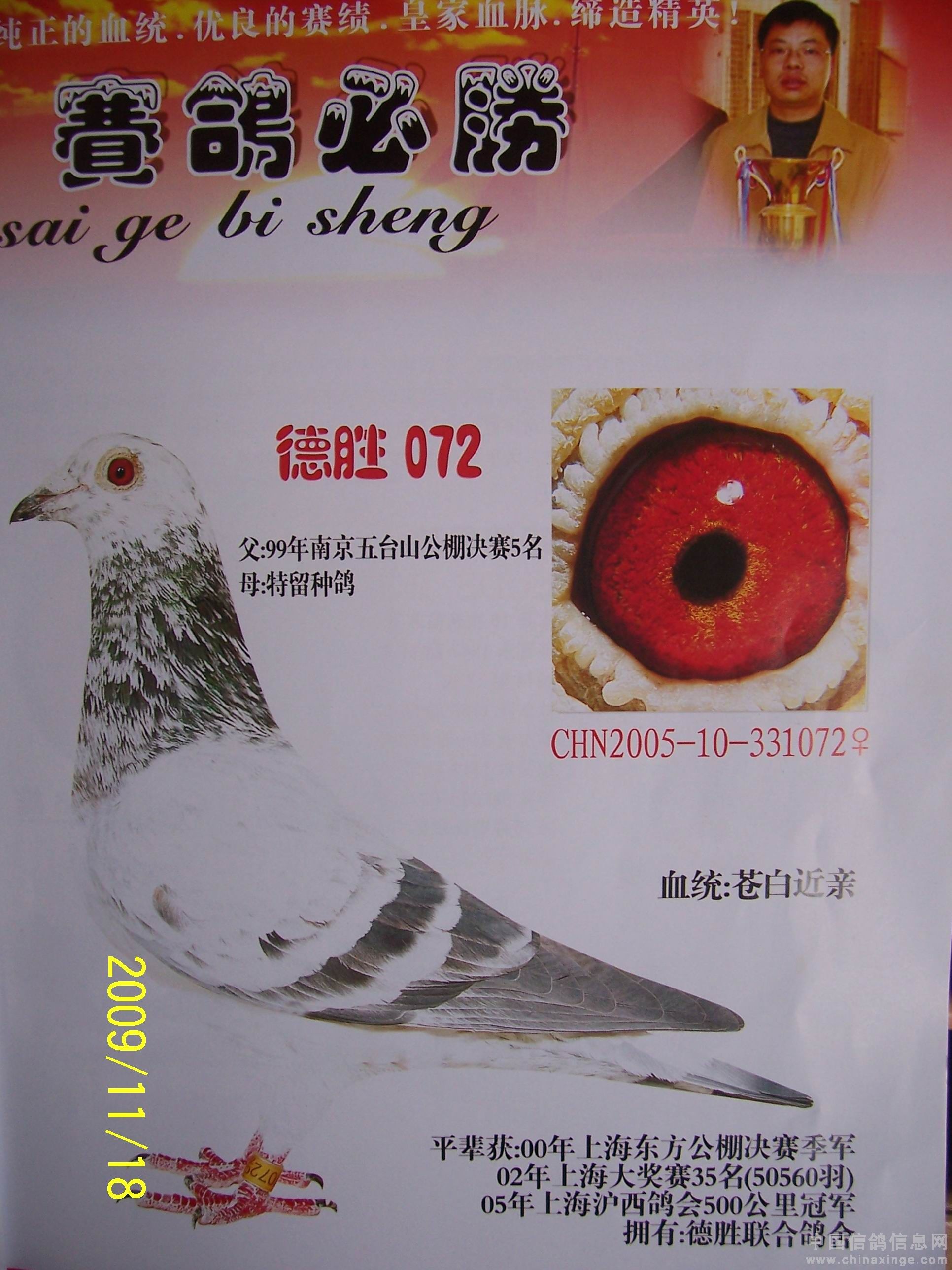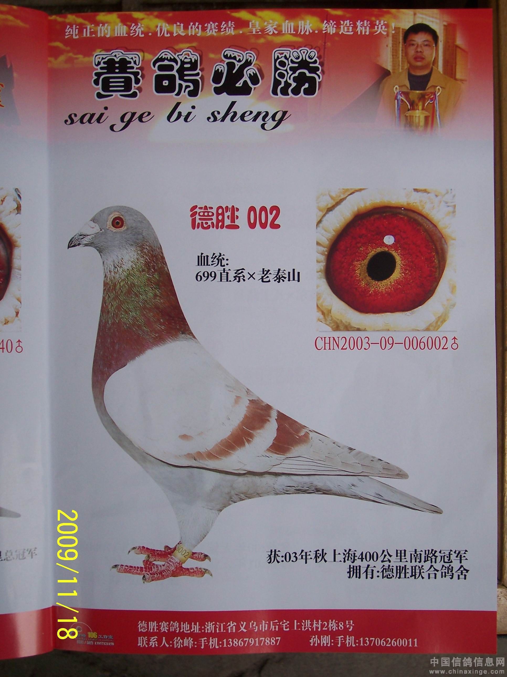 孙刚与徐峰两位鸽友合作建立的“德胜联合鸽舍”,是昆山鸽坛“股海”的一支“潜力股”,近年来,他俩不惜重金,广纳名鸽优种,今年秋季参赛即初见成效,投放幼鸽双关赛仅一羽鸽子,一举夺得了300/500公里幼鸽双关赛总冠军(详见鸽协成绩表,鸽主名为:徐峰)。现将他们于《浙江赛鸽》杂志上最新刊登的一些鸽照,推荐大家欣赏: