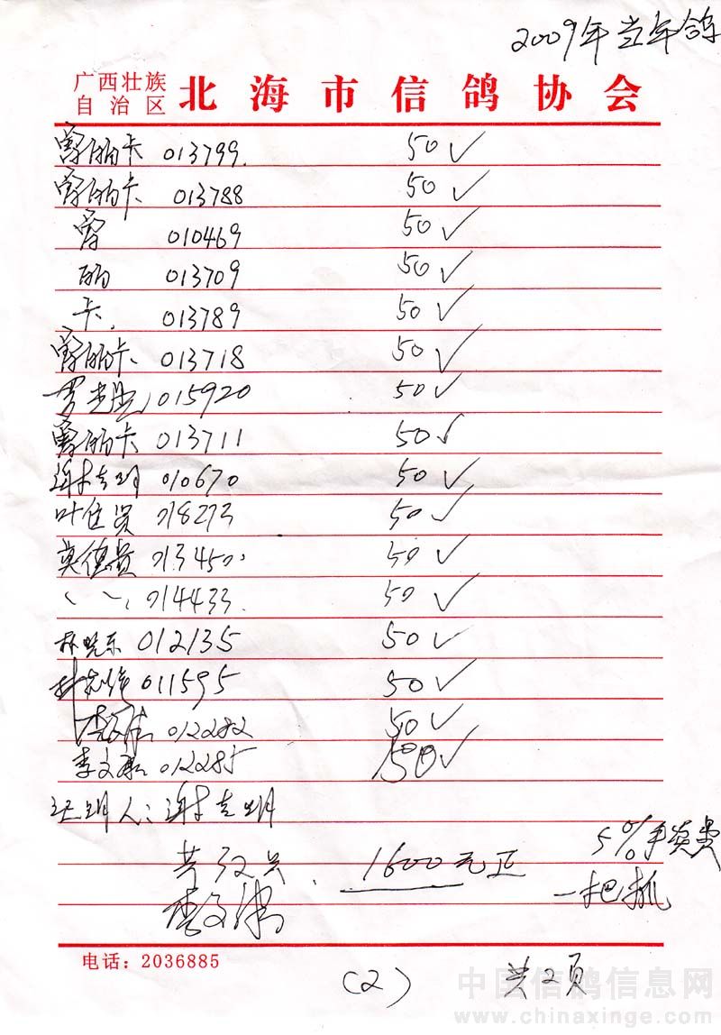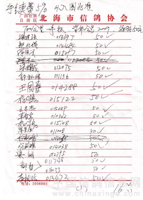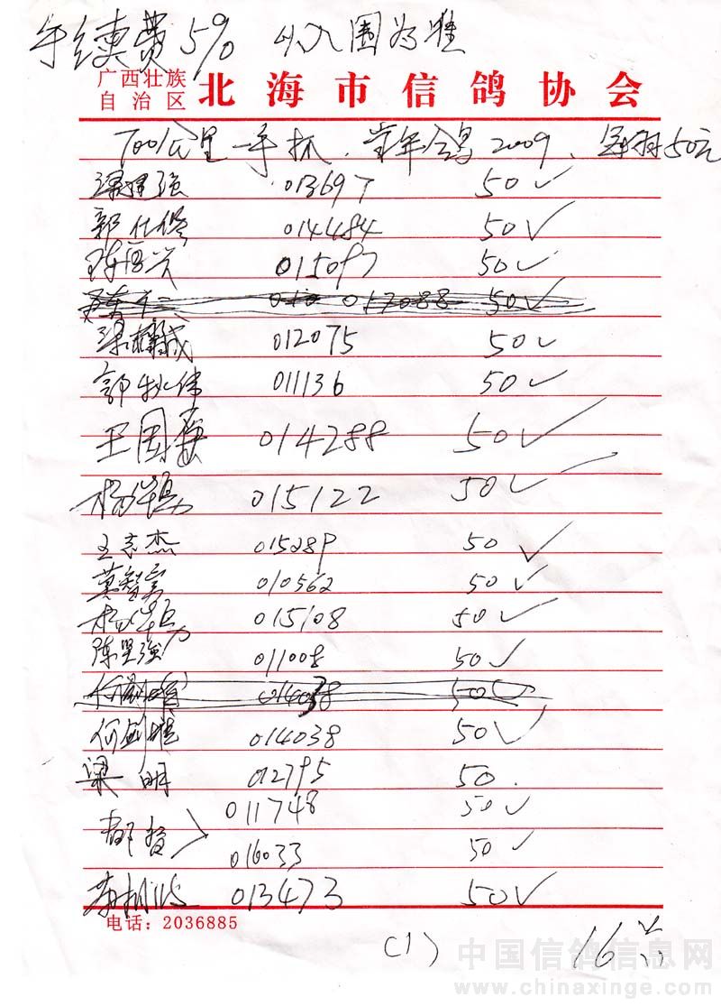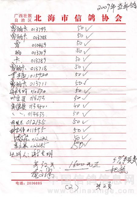 广西北海市信鸽协会2009年秋季700公里陆丰站(50元组)指定鸽名单