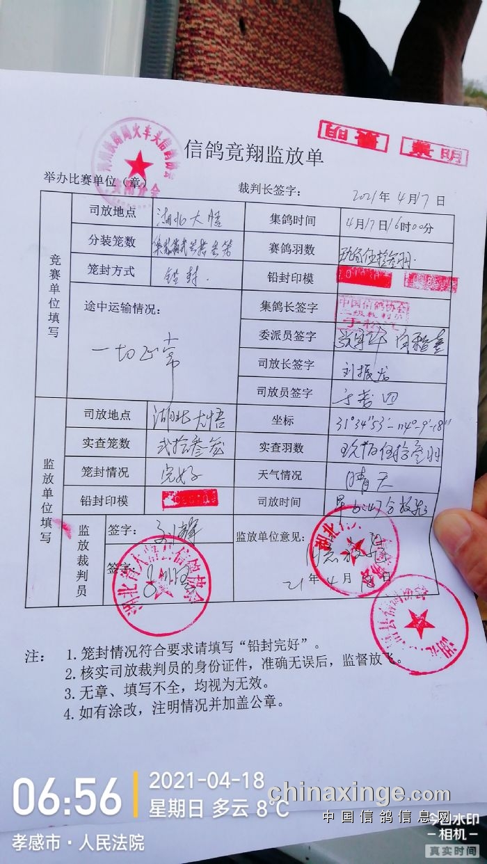 2021年春季四关赛第二关500公里大悟站今早6:47分在大悟开笼,距鸽会约499公里,司放地天气多云,无风,赛鸽定向良好。各项比赛及指定数据已上网,会员可上网查看。请会员提前检测鸽种,电子鸽钟属于电子产品,由于各种原因,随时都可能出现故障(如漏扫,不上传等现象),你在自愿购买时必须有所准备,集鸽前做好电子环,上传电话卡的检测(最好使用中国移动卡并开通GPRS功能),确保卡内话费余额充足,赛时尽早使鸽钟通电以免操作匆忙导致卫星定位及校时不准而致上传失误。个人操作失误致数据不准或不上传数据者,造成赛鸽无成绩协会概不负责。预祝参赛鸽友赛出好成绩。
