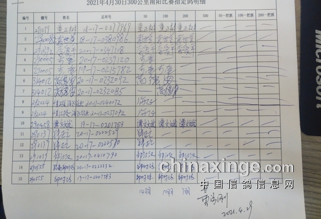 2021年4月30日意棋和300公里南阳比赛指定鸽明细