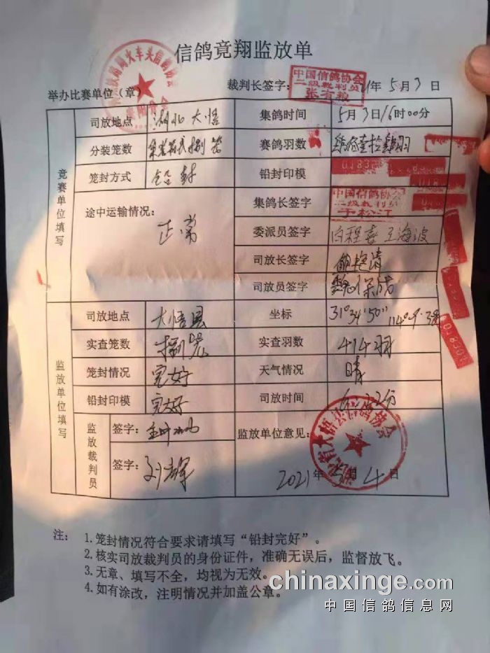 2021年春季四关赛第四关500公里大悟站今早6:22分在大悟开笼,距鸽会约498公里,司放地天气晴,无风,赛鸽定向良好。各项比赛及指定数据已上网,会员可上网查看。请会员提前检测鸽种,电子鸽钟属于电子产品,由于各种原因,随时都可能出现故障(如漏扫,不上传等现象),你在自愿购买时必须有所准备,集鸽前做好电子环,上传电话卡的检测(最好使用中国移动卡并开通GPRS功能),确保卡内话费余额充足,赛时尽早使鸽钟通电以免操作匆忙导致卫星定位及校时不准而致上传失误。个人操作失误致数据不准或不上传数据者,造成赛鸽无成绩协会概不负责。预祝参赛鸽友赛出好成绩。