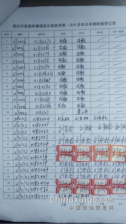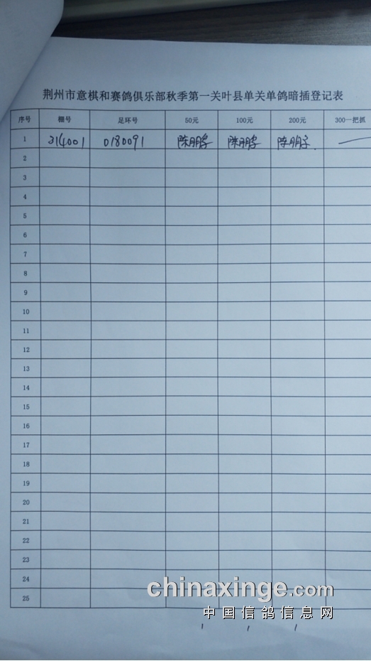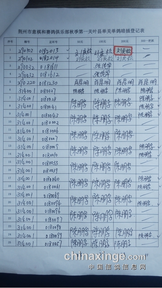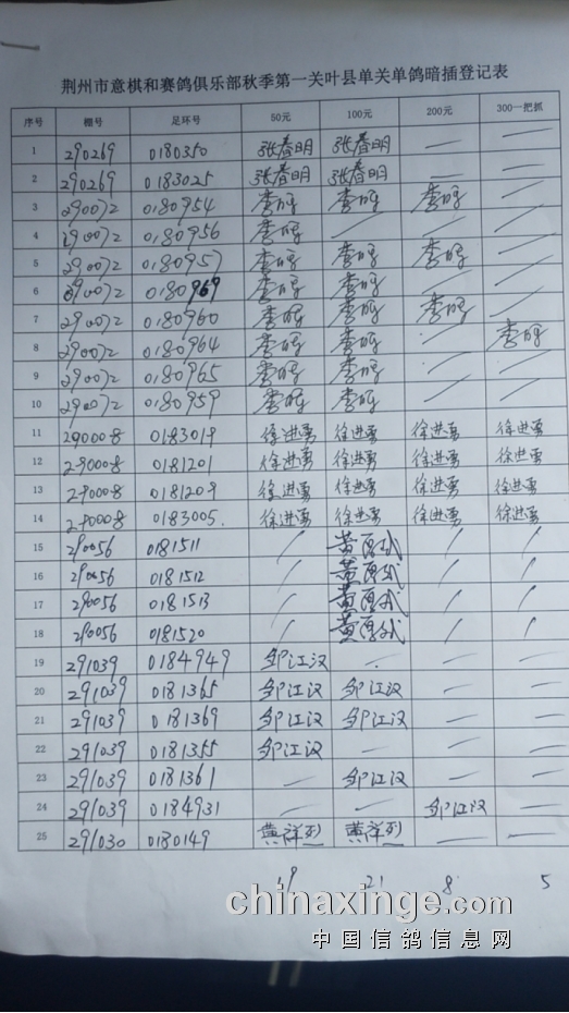 荆州意棋和赛鸽俱乐部秋季第一关叶县单关鸽暗插详情表