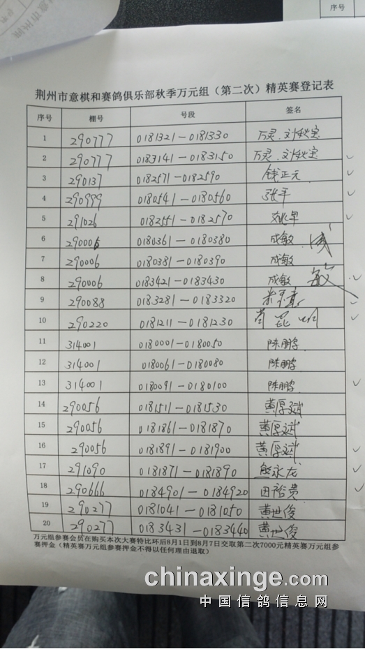 荆州市意棋和赛鸽俱乐部秋季万元组(第二次)精英赛登记表