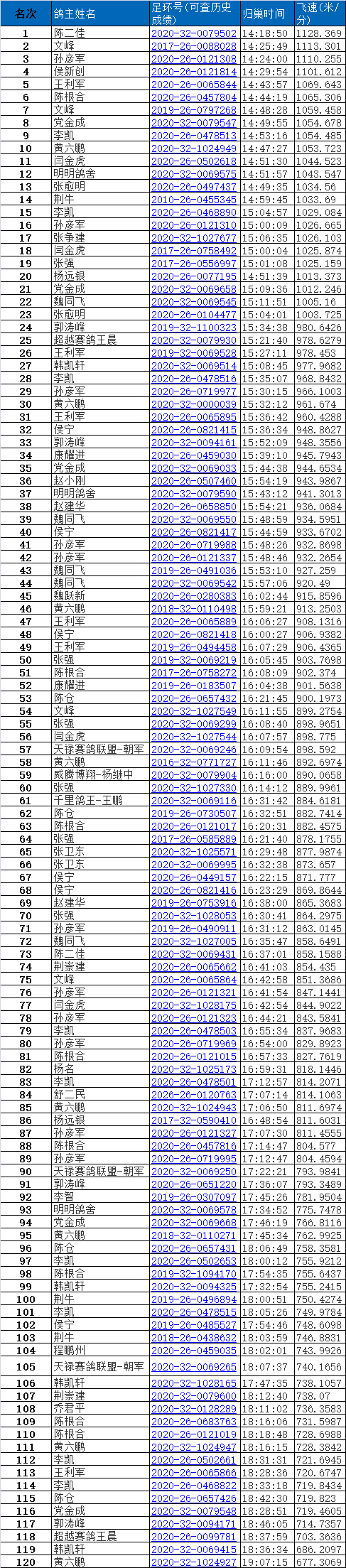 咸阳铁路信鸽协会2024年秋季第二关指定成绩