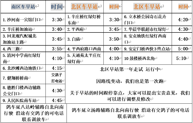亲爱的各位鸽友,训放车2021年秋季北区早站为试运行中我们会根据大家的需求做相应的变动,