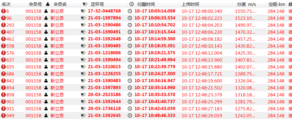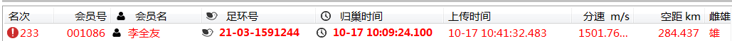 1284 777777 张磊鸽业 21-03-1435774 雄 黄 雨点 2021-10-17 13:47:03 282.4220 693.8162