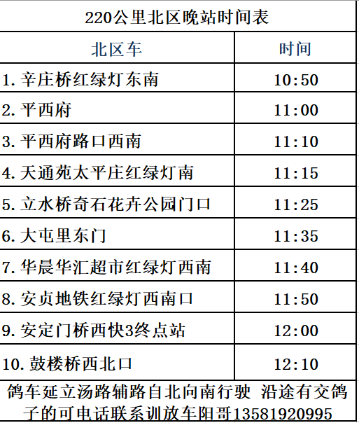 10月19日220公里连夜走车,晚站有报站(定州服务区) 10月20日80公里(涿州服务区) 10月21日100公里(保定北出口) 南区北区2辆车同时进行训放集鸽正常 包笼请提前电话️ 联系 北区包笼小冯18701278569 训放阳哥13581920995北区车 紫蔷薇 13671287180南区车 如有变动(以微信网上通知为准确) 请鸽友相互转告( ˃̶̤́ ꒳ ˂̶̤̀ )