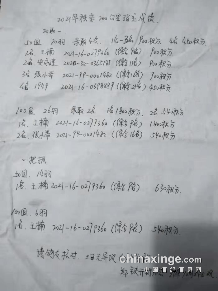 郑铁开封分会2021年秋200公里比赛指定鸽成绩