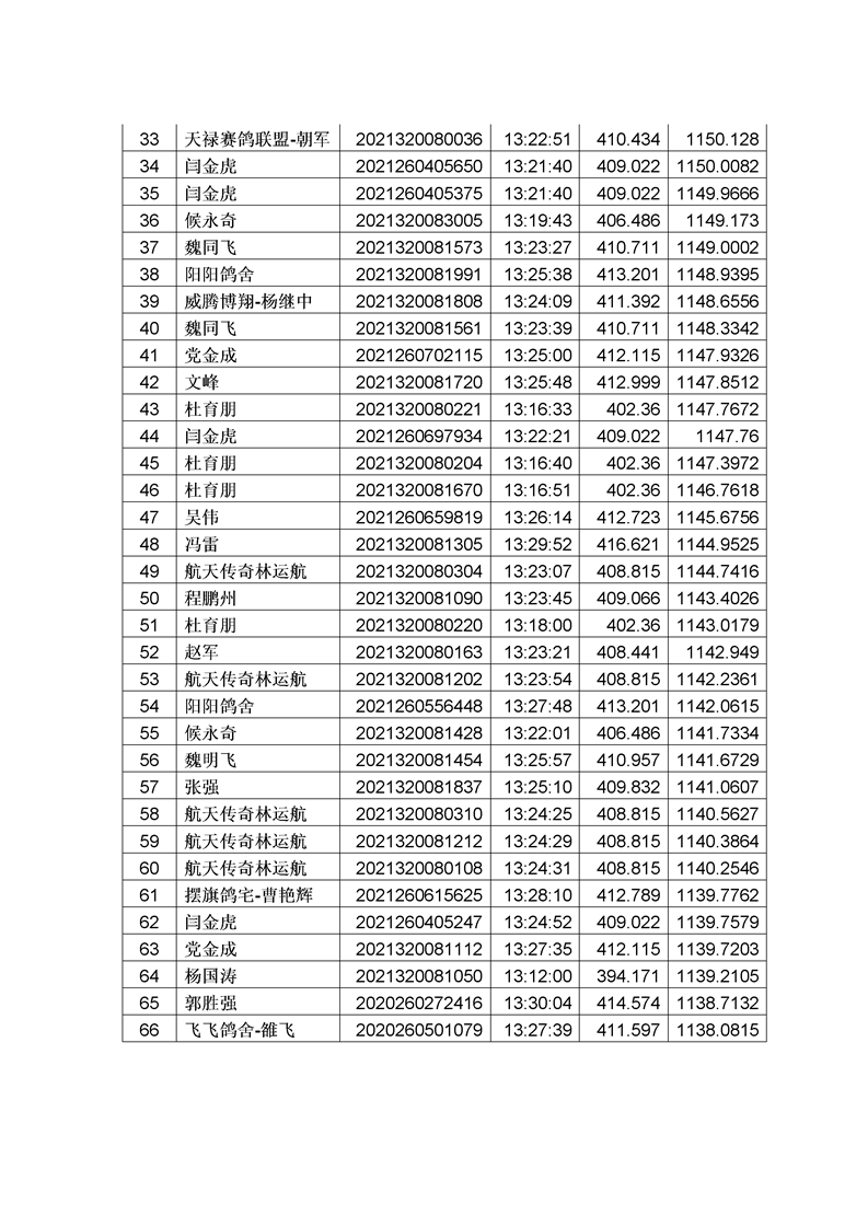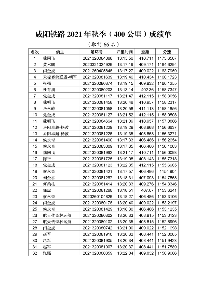 咸阳铁路信鸽协会2024年秋季第二关指定成绩
