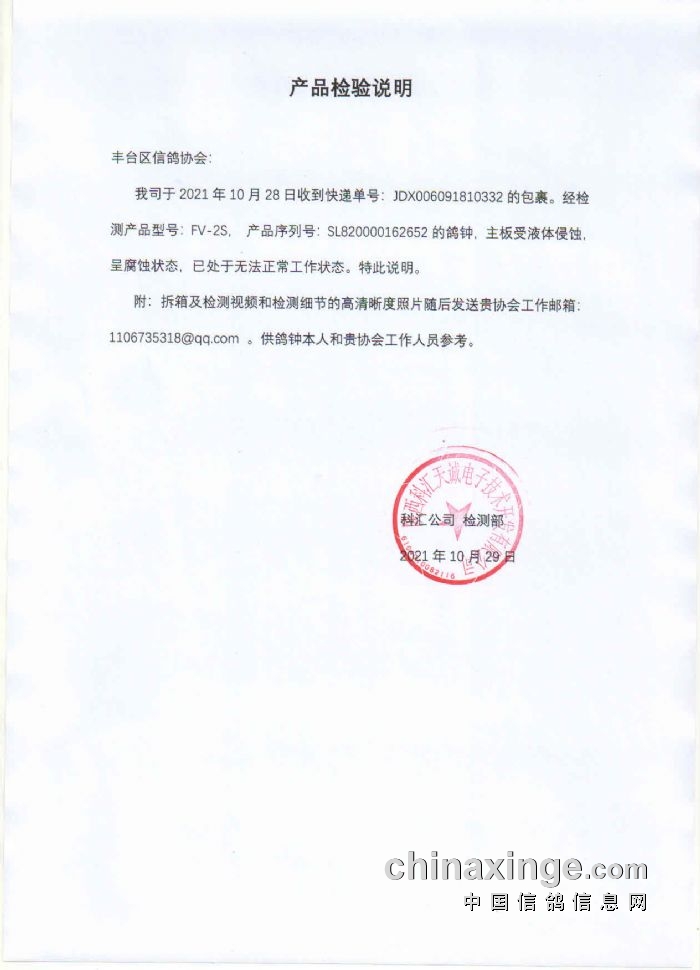 现科汇公司已收到被鉴定鸽钟,经拆箱检测后,认定鸽钟因主板受液体侵蚀导致无法正常工作。以下是拆箱图片及检验报告;