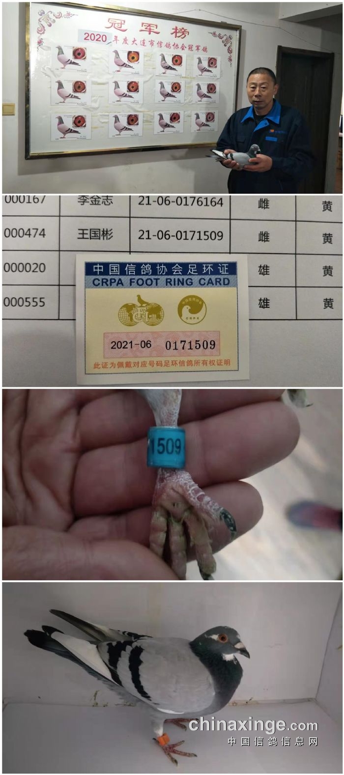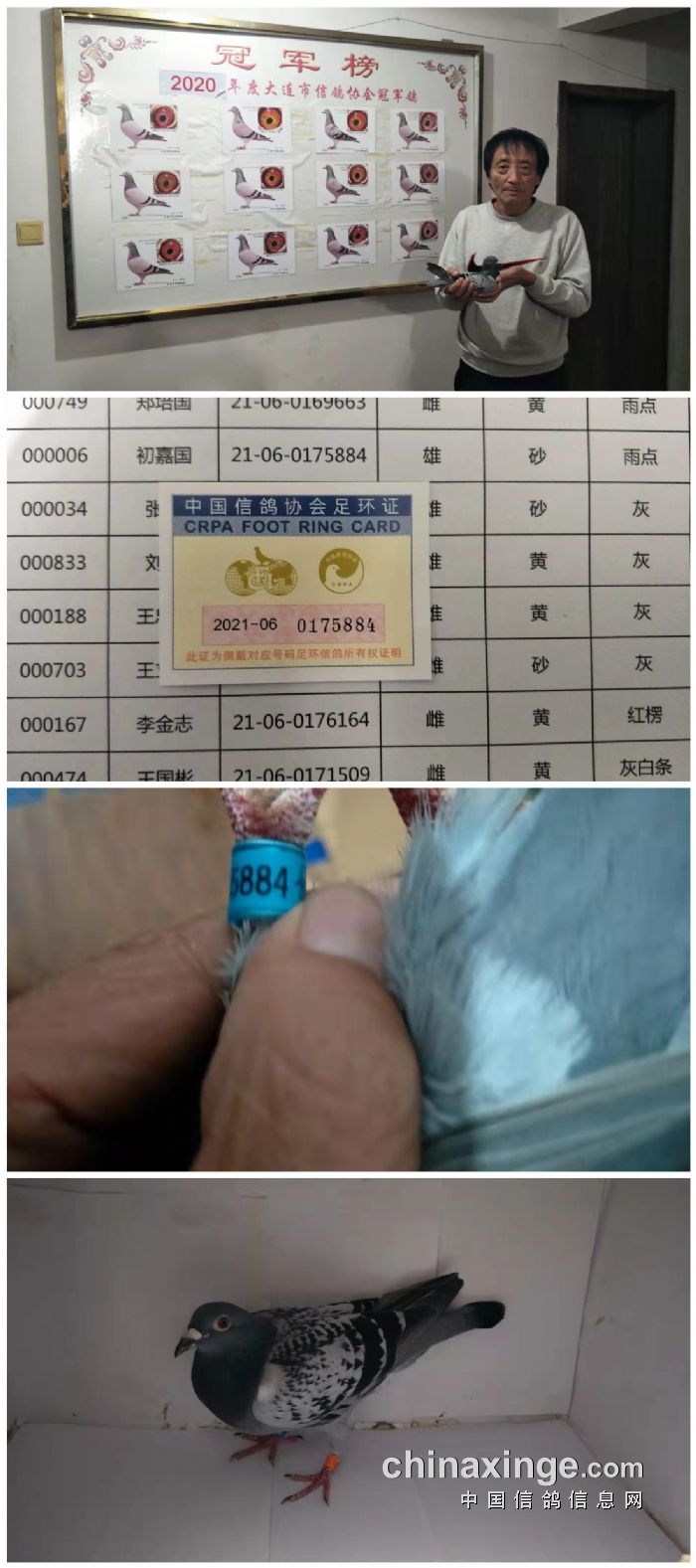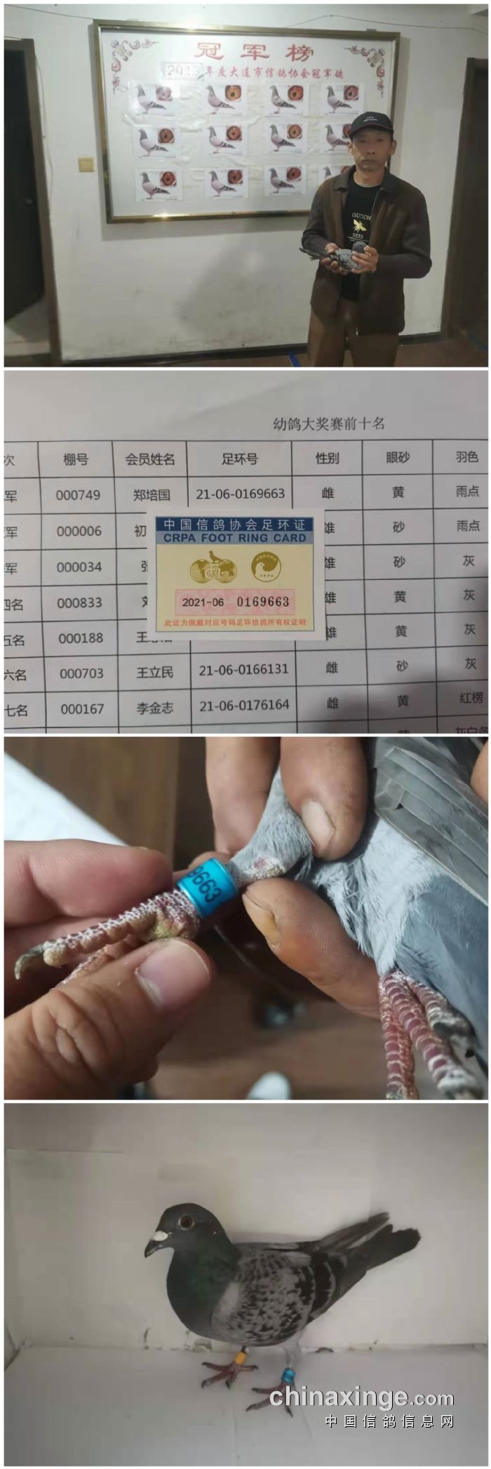 冠军 棚号:000749 郑培国 21-06-0169663 雌 黄 雨点 飞速(米/分):1204.9146