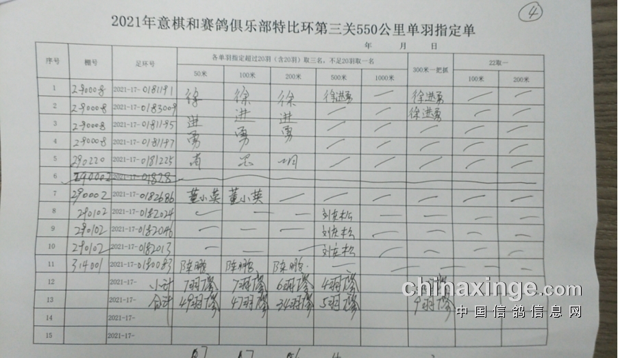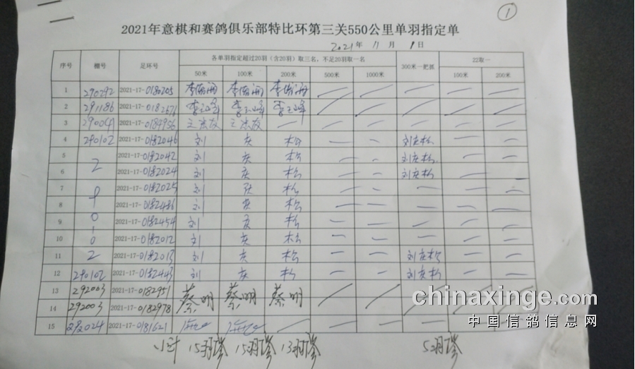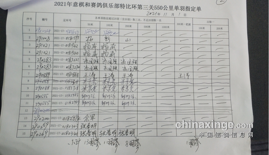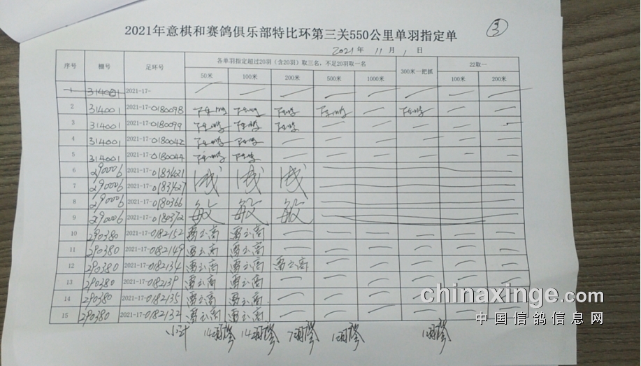 2021年11月1日特比环第三关550公里原阳单羽指定鸽名单