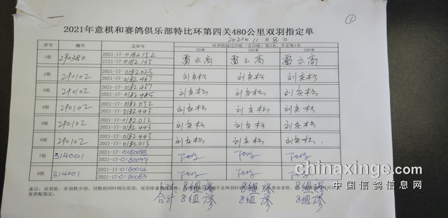 2021年11月8日特比环第四关500公里新郑双羽指定鸽清单