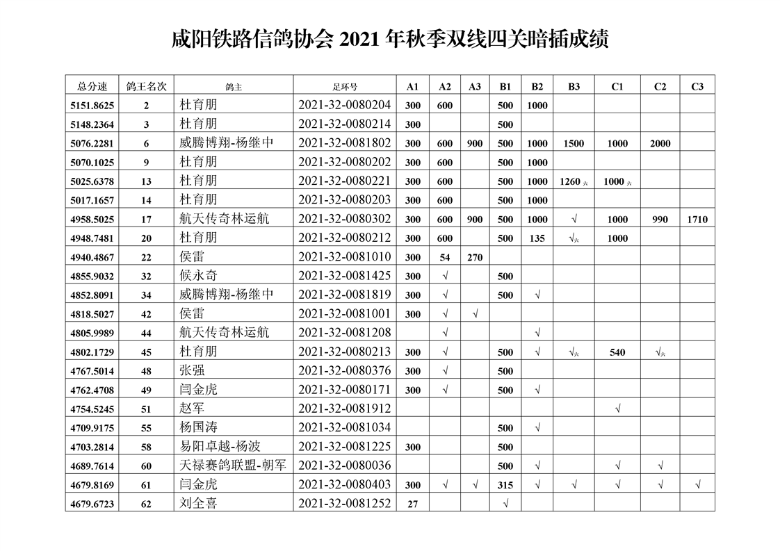 咸阳铁路信鸽协会2024年秋季特比环双关暂排成绩