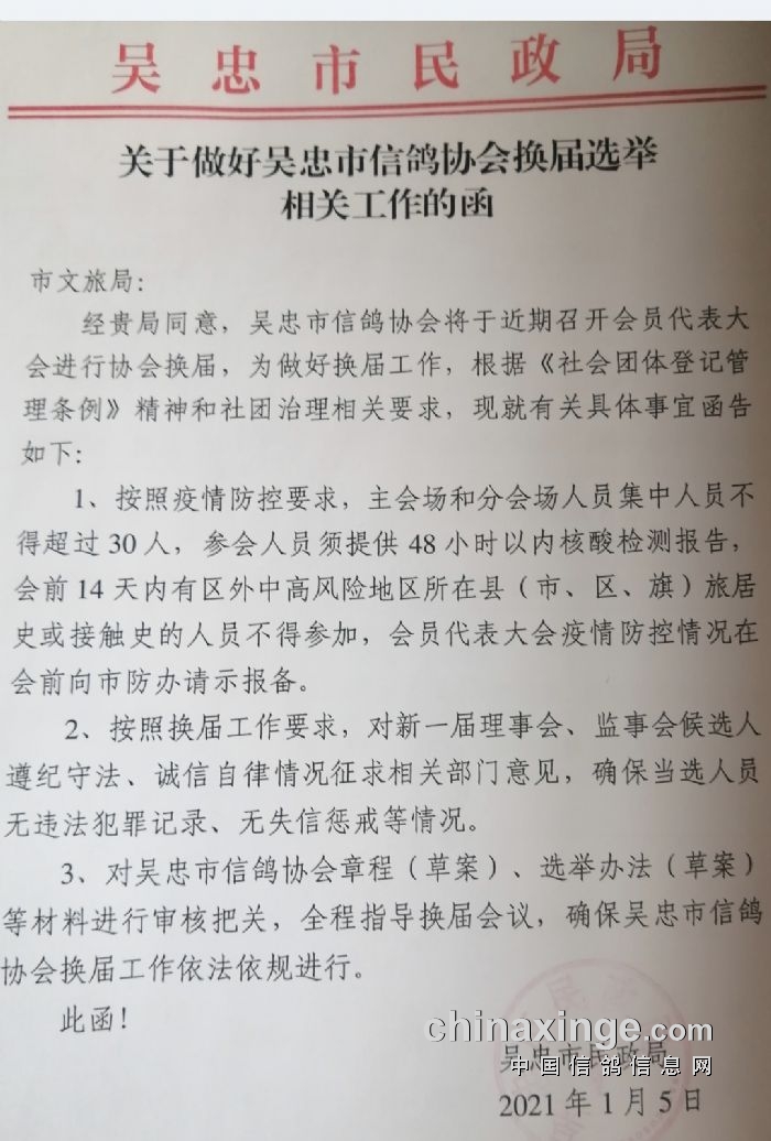 按照防疫办、民政局、体育局要求:参加第四届换届选举大会的会员1月9日上午10点—下午16点到新妇幼保健院做核酸,请带好身份证以及手机app“我的宁夏”按时做好核酸检测工作。没有核酸报告的会员不得参加会议。请广大会员相互转告。协会将会派专人在妇幼保健院核酸检测处为大家引导服务(核酸费用由协会承担)