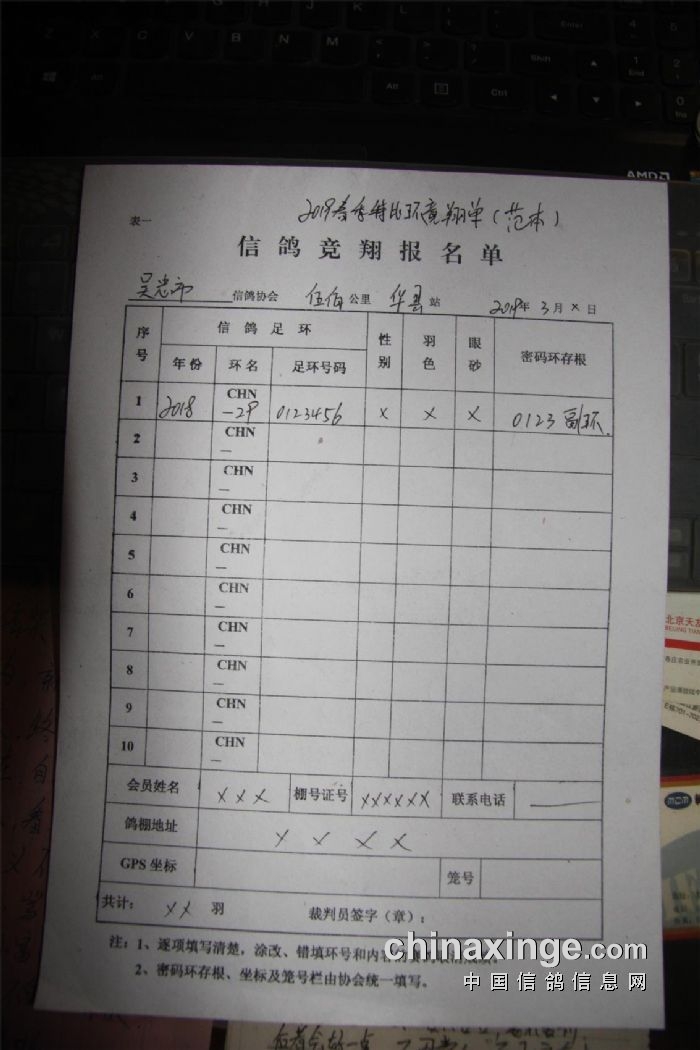 二、春季特比环参赛鸽填写竞翔单一式一份,集鸽时连同参赛鸽交给集鸽员。范本如下:(由于粘贴自以前范本,赛鸽年份及年月日按照集鸽当日填写)