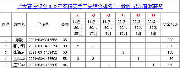 大曹庄鸽会精英赛三关综合验鸽暗查临时成绩