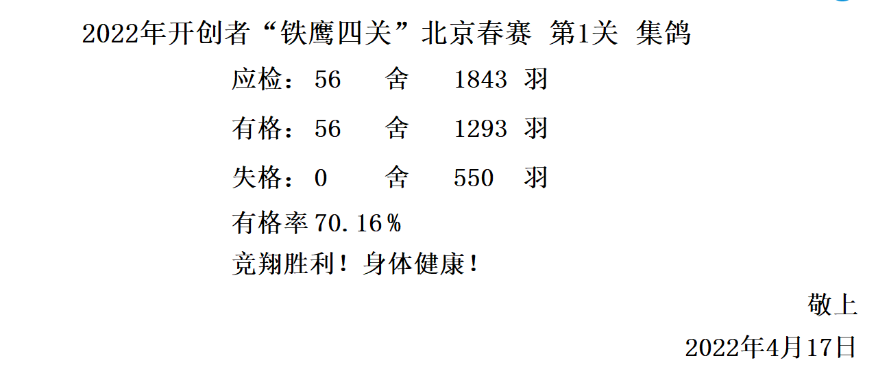 2022年大兴鸽会开创者“铁鹰四关”北京春赛第一关共集鸽1293羽