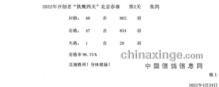 2022年大兴鸽会开创者“铁鹰四关”北京春赛第二关共集鸽834羽
