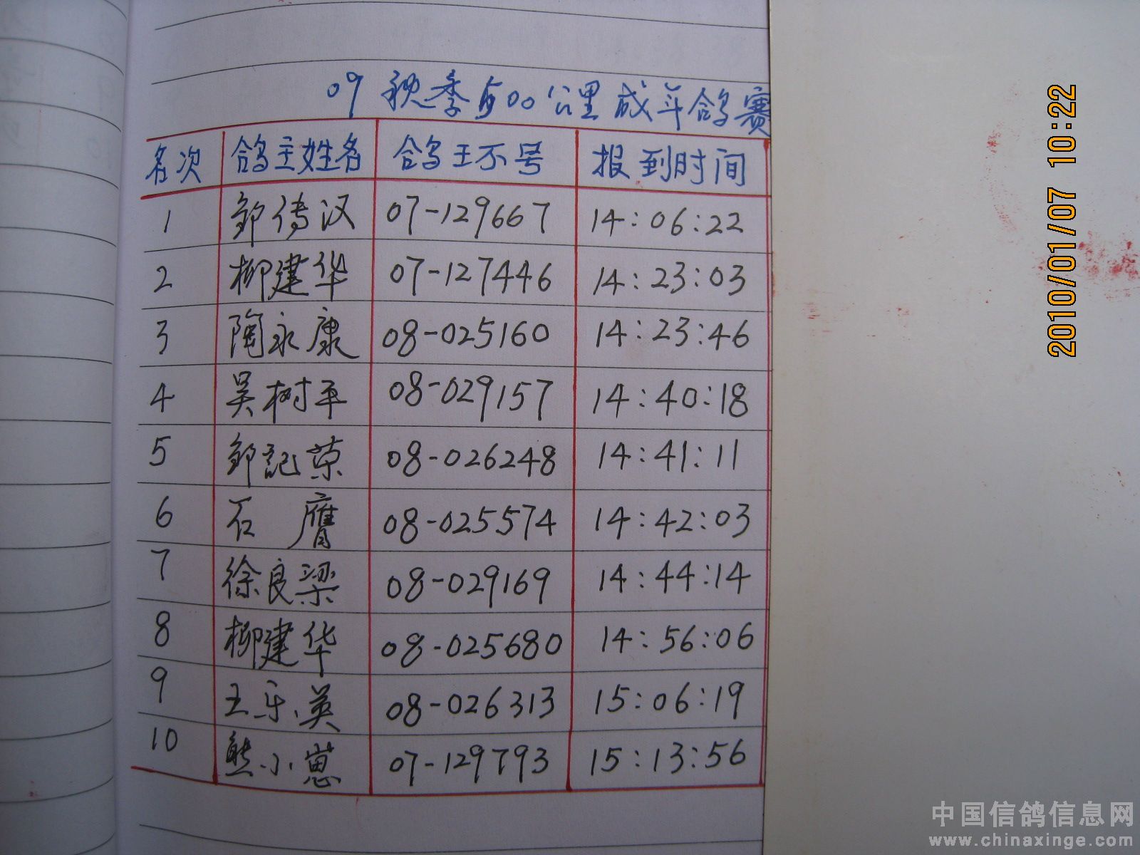 乐平市信鸽协会2009年季500公里成年鸽赛成绩