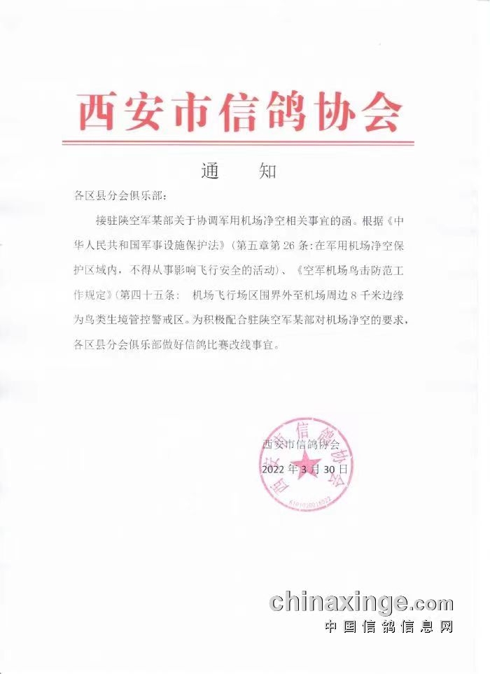 接驻陕空军某部关于协调军用机场净空相关事宜的函。根据《中华人民共和国军事设施保护法》(第五章第26条:在军用机场净空保护区域内,不得从事影响飞行安全的活动)、《空军机场鸟击防范工作规定》(第四十五条: 机场飞行场区围界外至机场周边8千米边缘为鸟类生境管控警戒区。为积极配合驻陕空军某部对机场净空的要求,本协会比赛路线改为正北,西北方向。(训放至神木站为北线,最后一关定为银川站)特此通知。