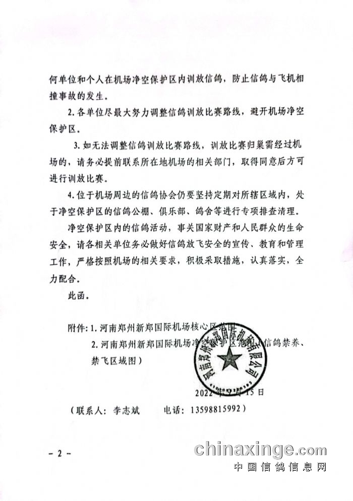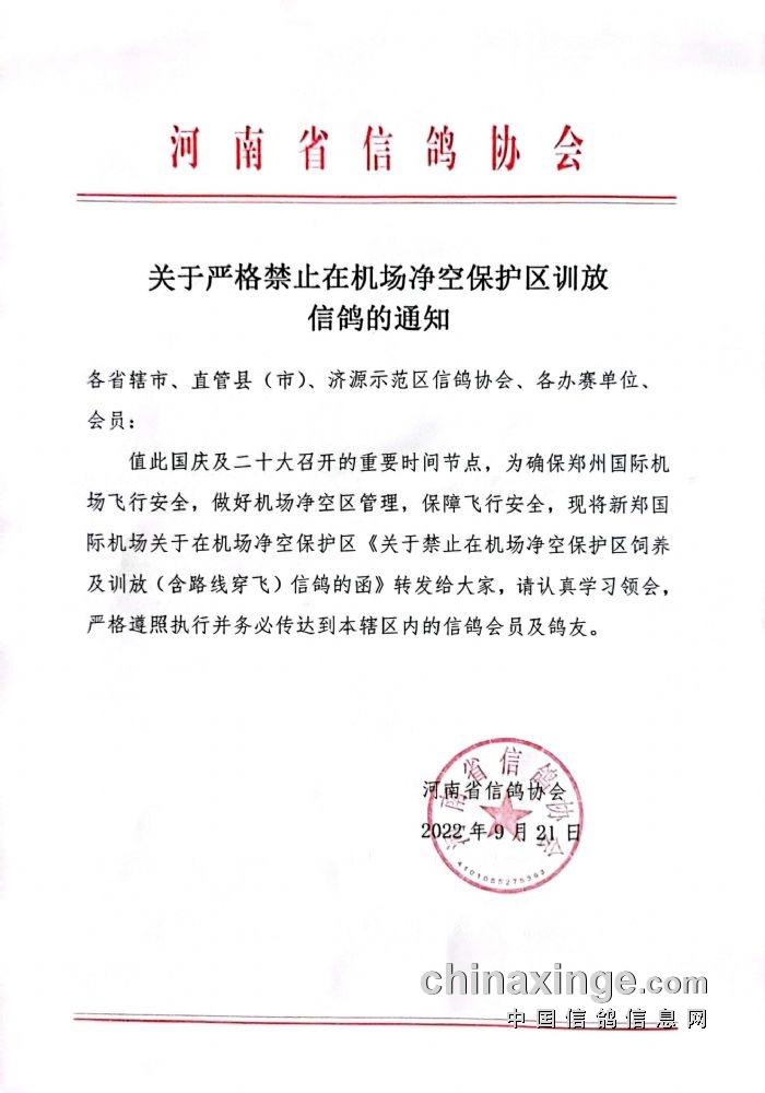 关于禁止在郑州新郑国际机场净空保护区内开展信鸽养殖、放飞等各类信鸽活动的通知