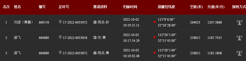 10月1日10点19分,鸽友刘波(黄集)的一羽赛鸽17-2022-0033972 雌-雨点-砂,飞行264公里,以1207.3868米/分获得冠军。鸽友郝飞的一羽赛鸽17-2022-0033858 雄-灰-黄 ,以1187.7435米/分速获得亚军,鸽友郝飞的另一羽赛鸽17-2022-0033872 雌-雨点-黄 ,以1181.0858米/分获得季军。