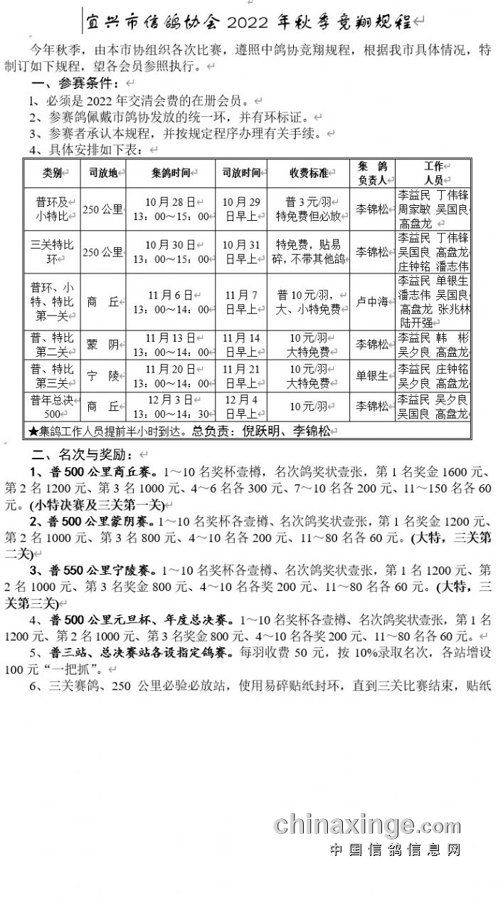 宜兴市信鸽协会2022年秋季竞翔规程