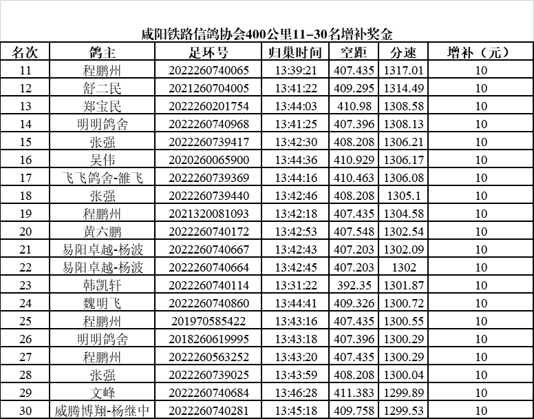 咸阳铁路信鸽协会400公里11-30名增补奖金单