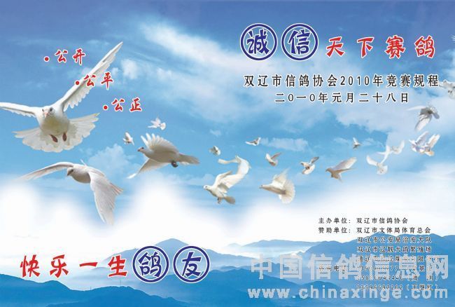 一、主办单位:双辽市信鸽协会 二、竞赛宗旨:以公平、公开、公正为竞赛宗旨,来检验和提高 我市的竞翔水平。
