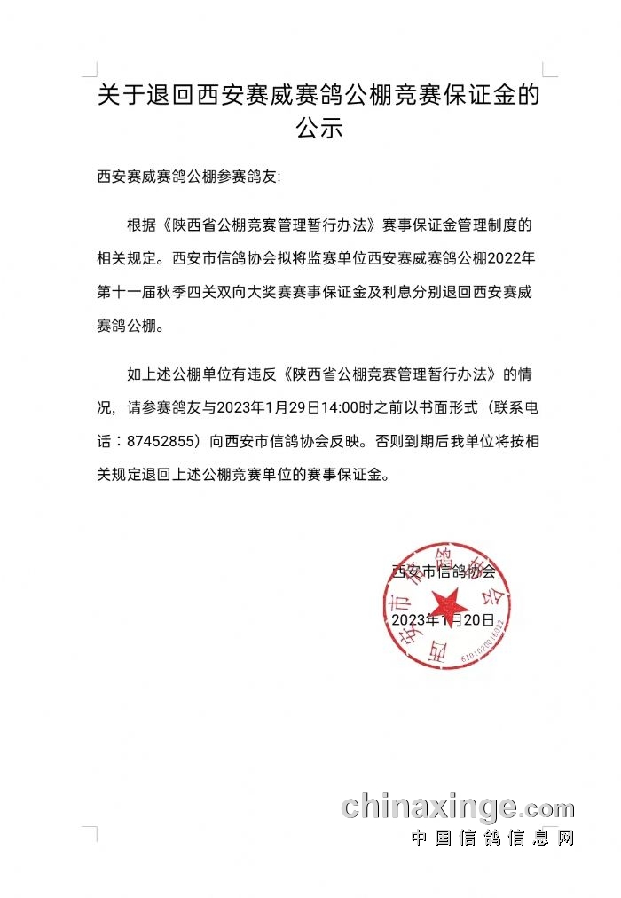 关于退回西安赛威赛鸽公棚竞赛保证金的公示
