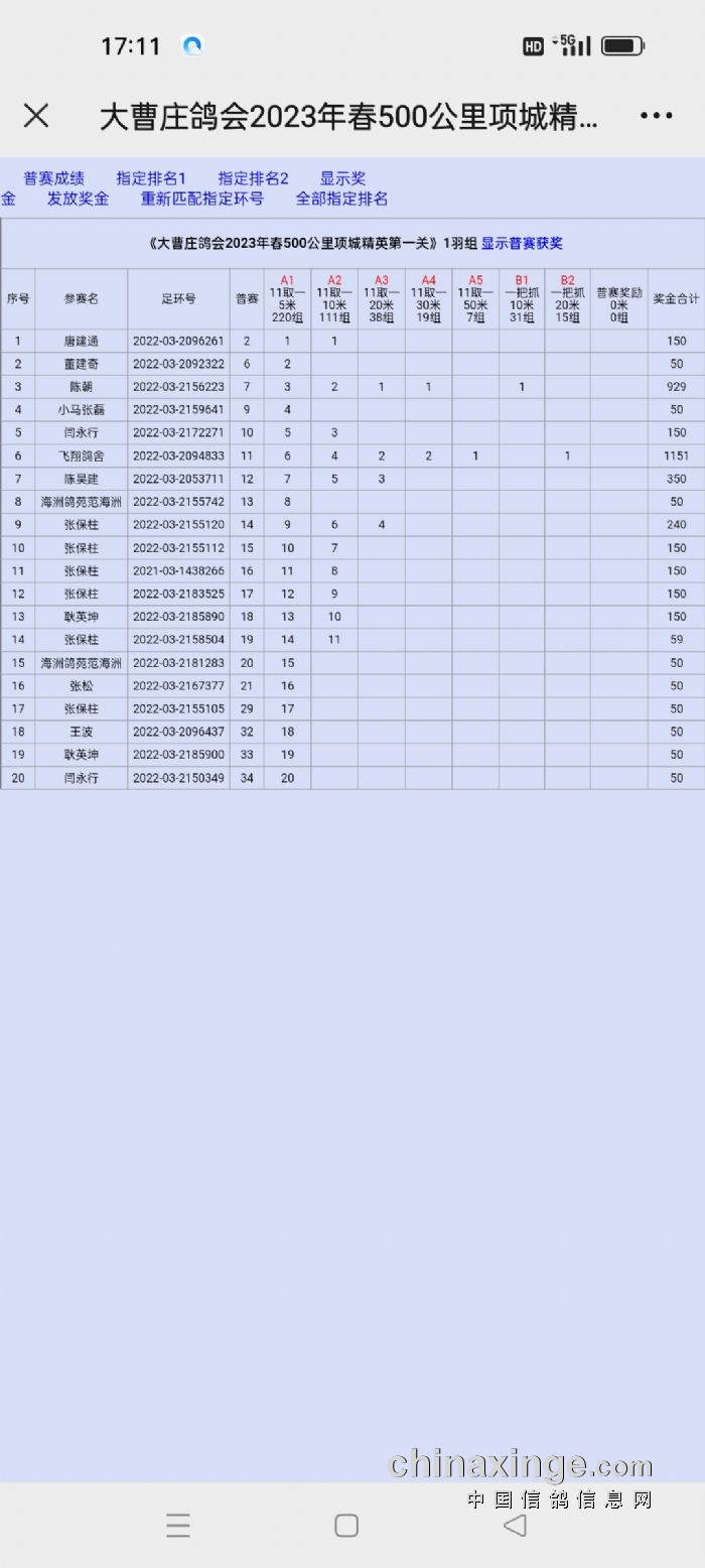 大曹庄鸽会25年秋220、280、340、380、500公里五关鸽王临时成绩
