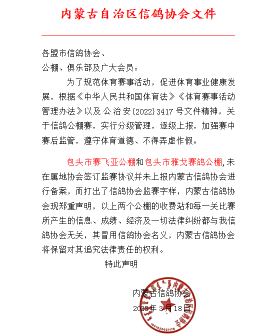 内蒙古信鸽协会关于公棚未申报监赛的声明