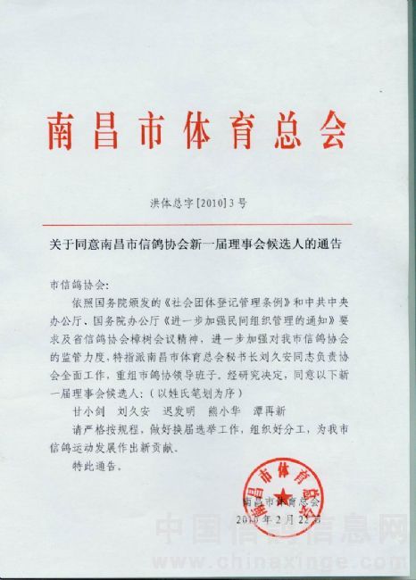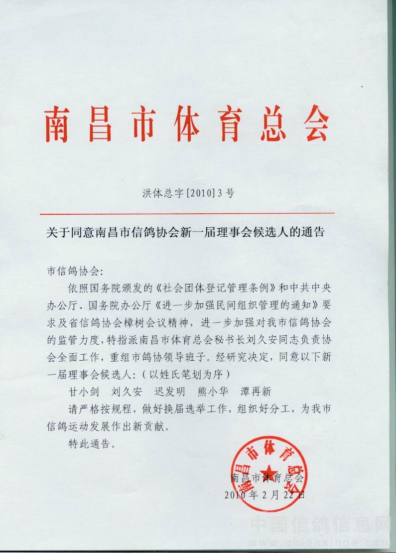 关于同意南昌市信鸽协会新一届理事会候选人的通告