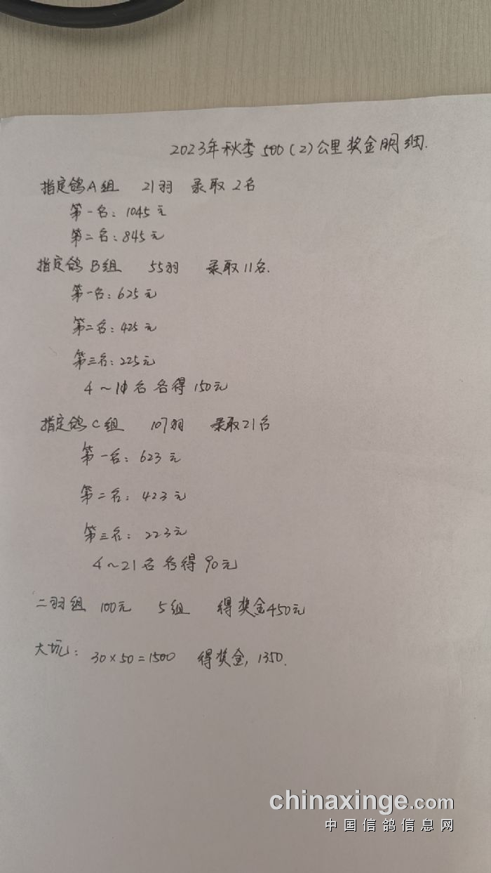 哈尔滨市2023年秋季650公里一把抓成绩预稿