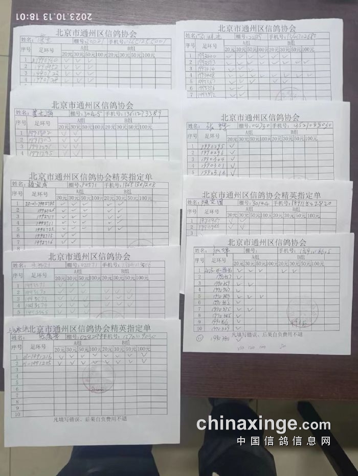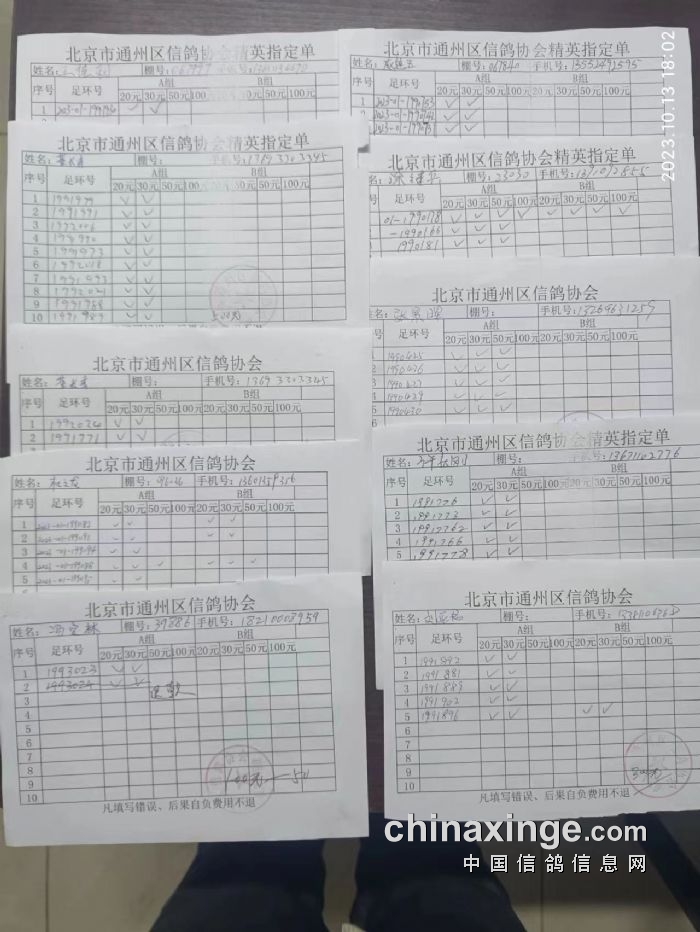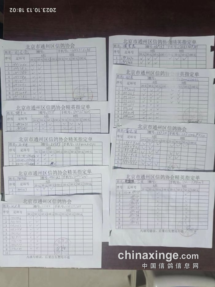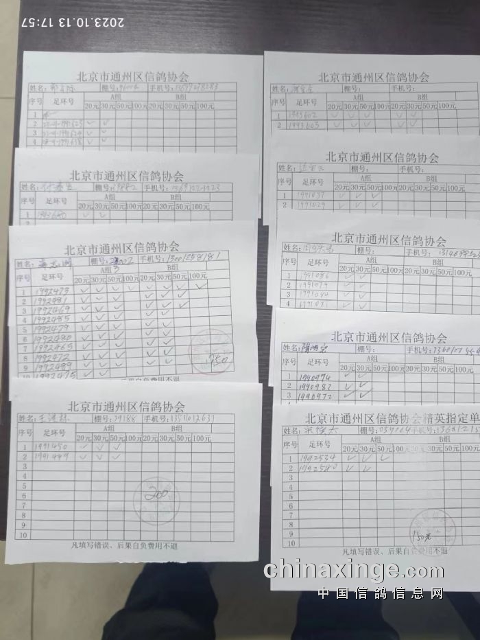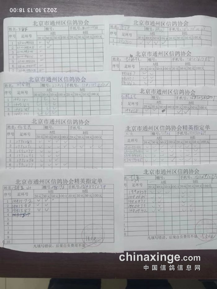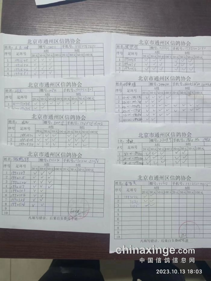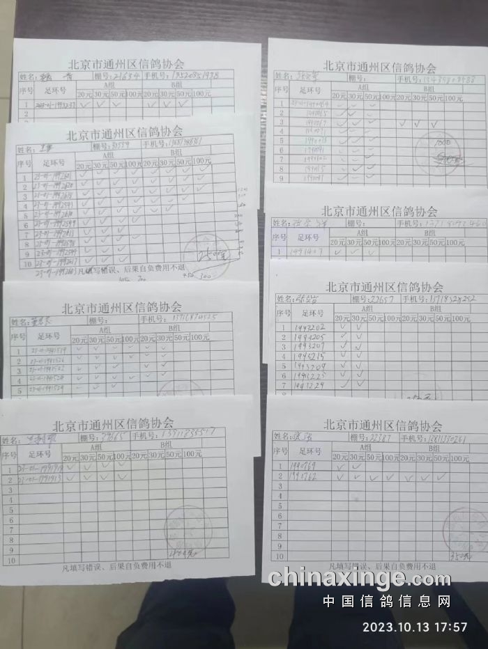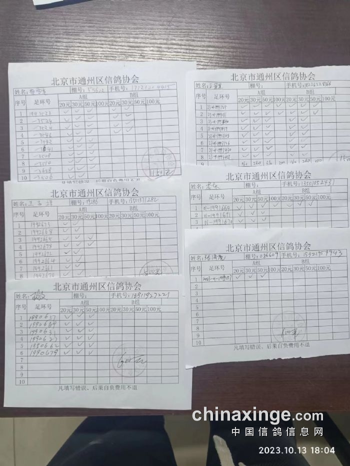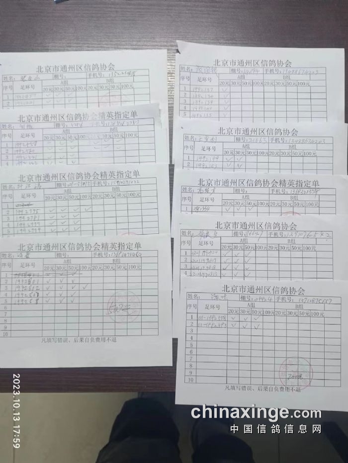 通州区信鸽协会2023年10月13 日500公里特比环第一关现场AB组原单