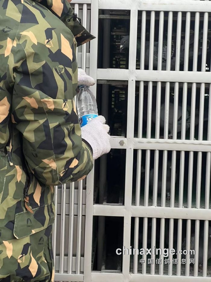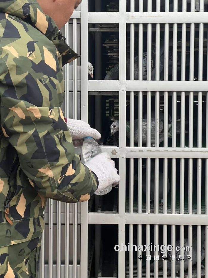 丰台鸽会工作人员给特比环第四关压笼参赛鸽喂水喂粮。