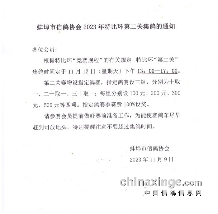 蚌埠市信鸽协会2023年秋季特比环第二关集鸽的通知