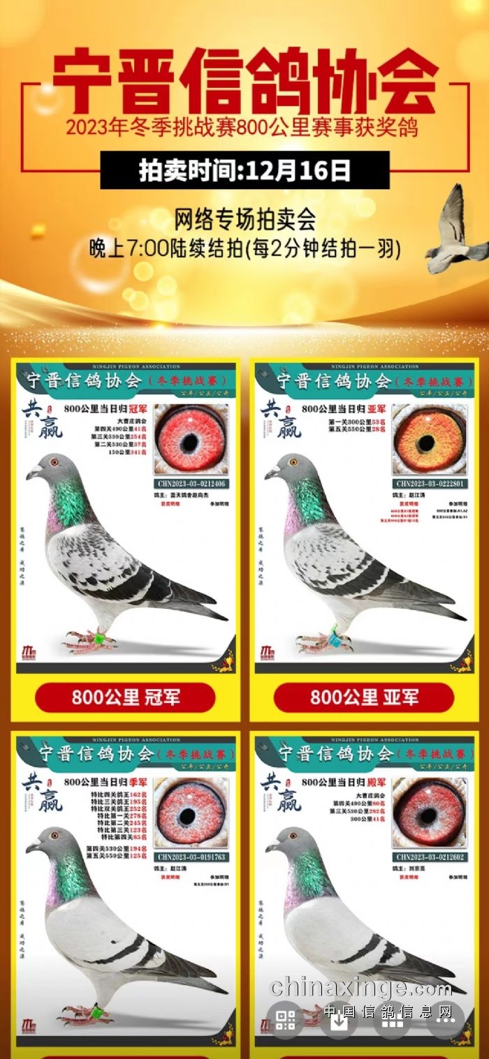 冬季挑战赛800公里优胜鸽正在拍卖中