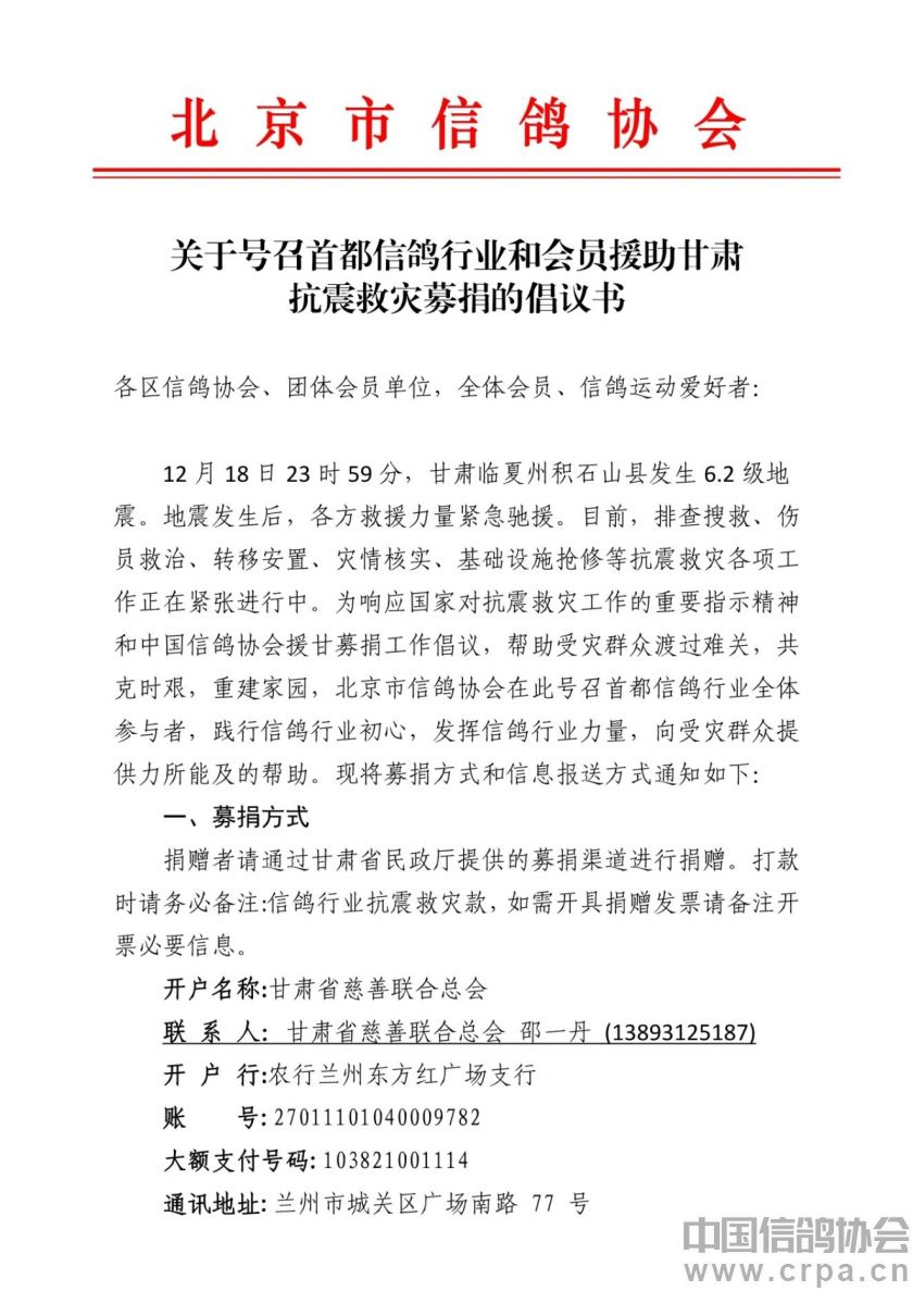 (房山区信鸽协会转发)关于号召首都信鸽行业和会员援助甘肃 抗震救灾募捐的倡议书