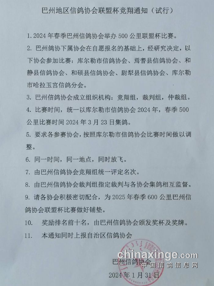 巴州地区信鸽协会联盟杯竞翔通知(试行)