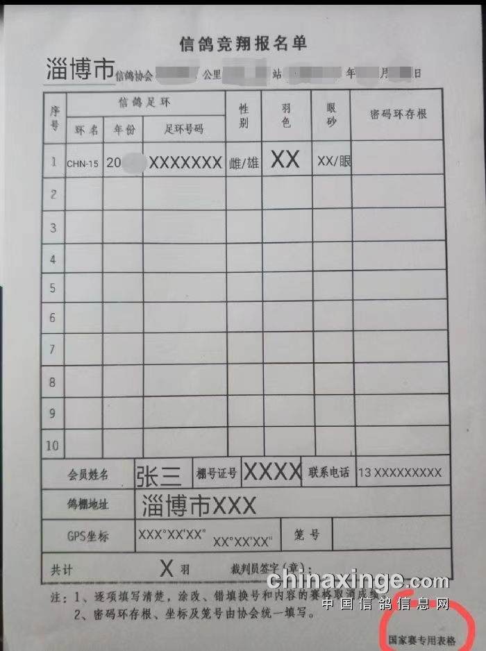 国家赛竞翔单填写模板