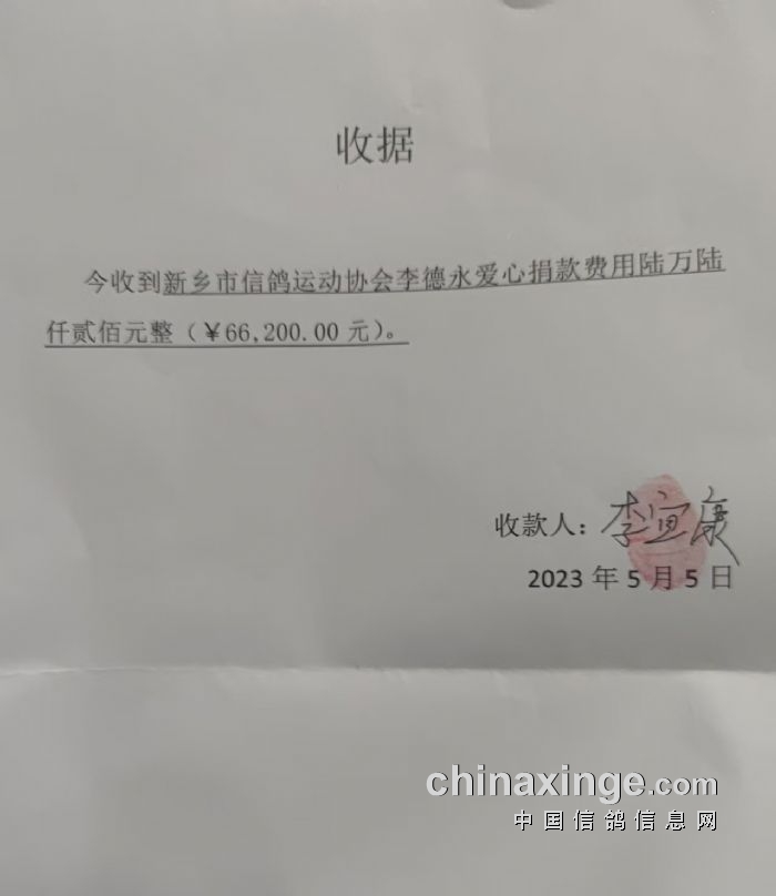 阎建立50元 河南省信鸽协会组织各地协会捐款16650元, 新乡市合计:49550元,总合计66200元