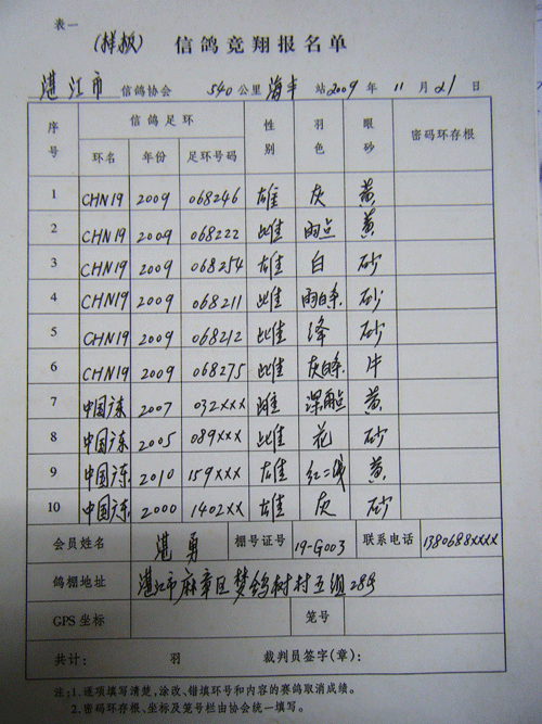 (1)、参赛者必须是2010年本协会在册会员,参赛鸽应套有一枚本会发售的全国统一足环,并有配套足环证备查,凡涂改,填错赛鸽环号,违反规定的一律取消资格,请新老会员认真对照咐在后面的(样板),[信鸽竞翔报名单]的方式填写均可,交鸽单必须由裁判员签名,鸽王赛全部资料按高标准严要求操作,不要粗心大意,马虎潦草,要把鸽王赛当成学习,调整,提高的好机会。