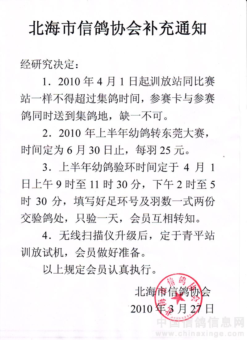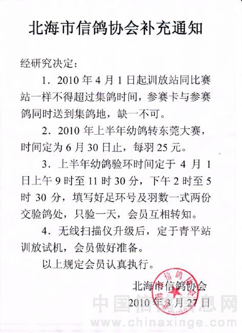 广西北海市信鸽协会2010年补充通知
