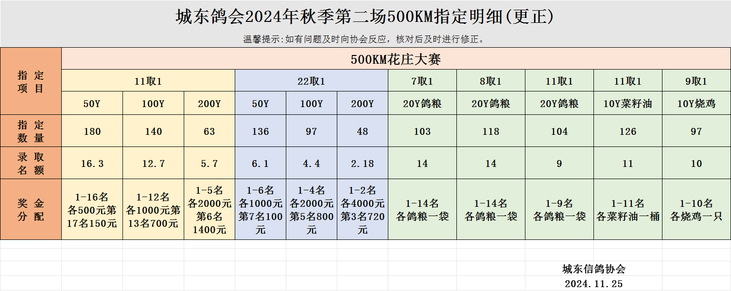 城东鸽会2024年秋季第二场500KM指定明细(更正)