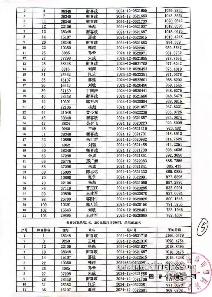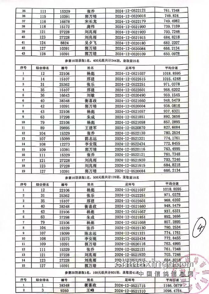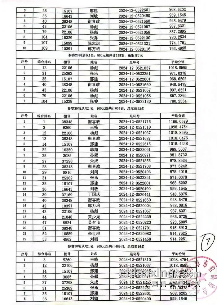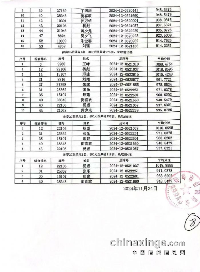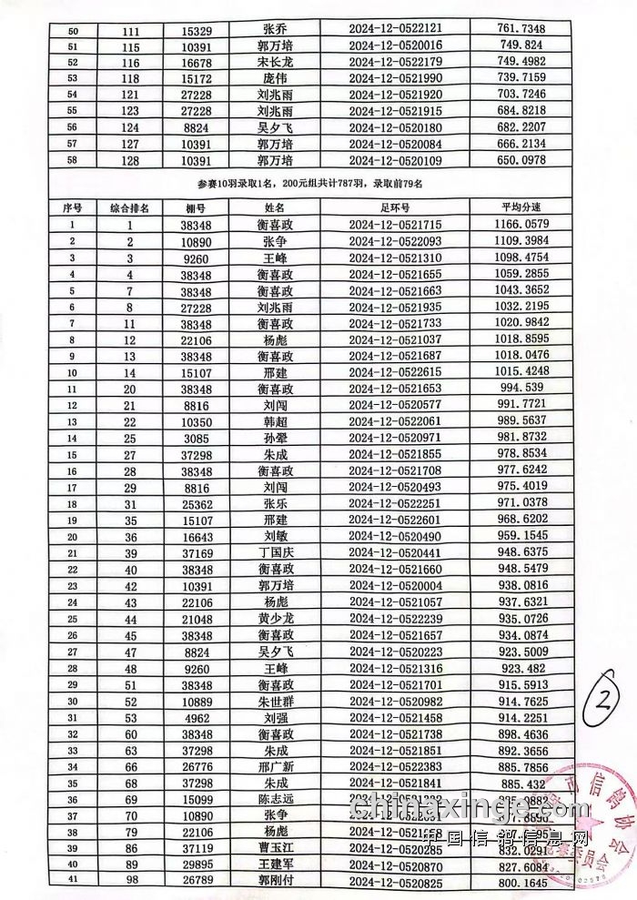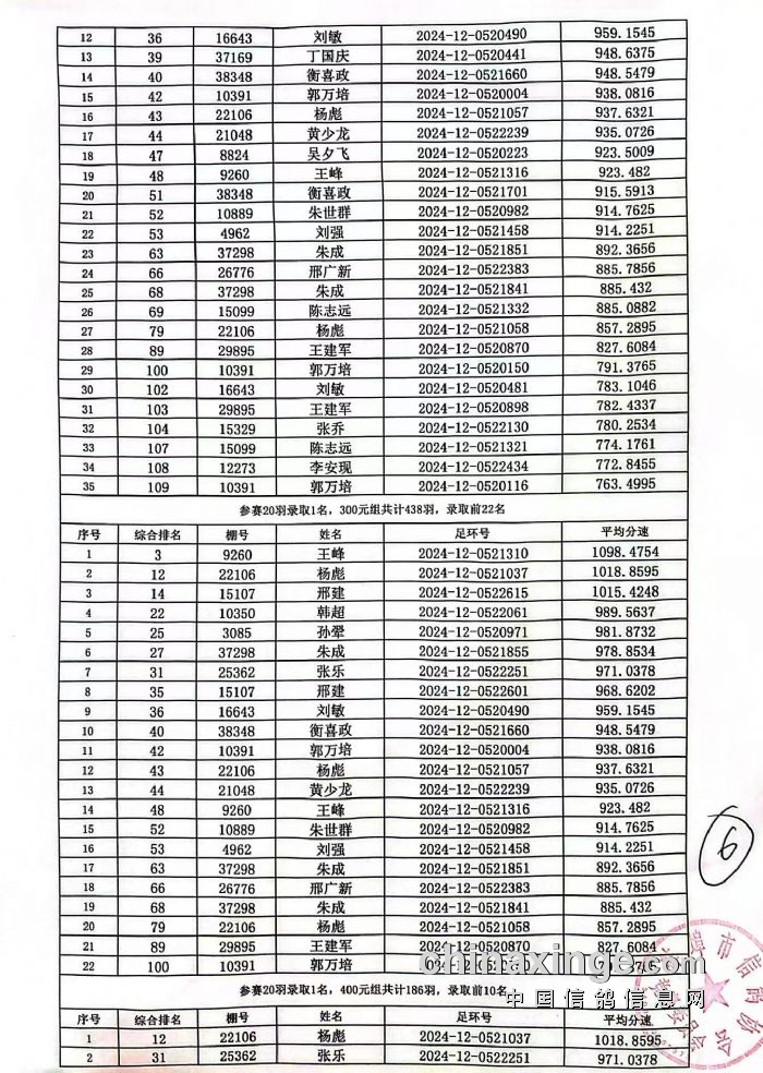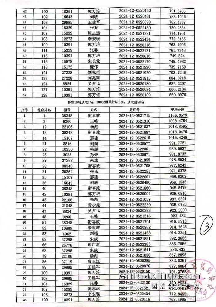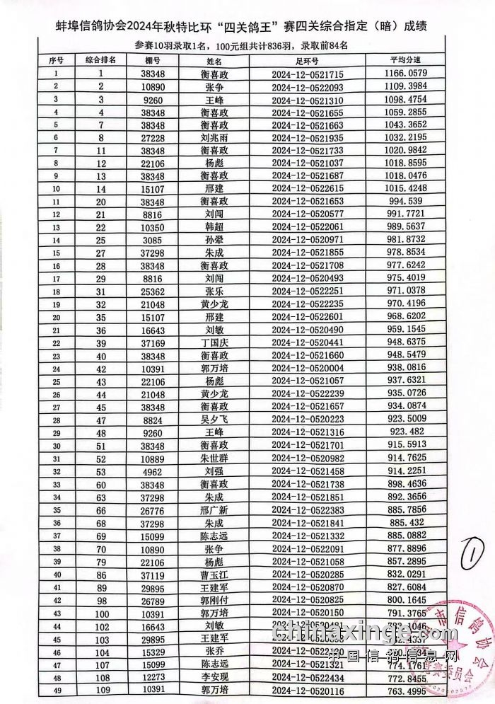 蚌埠市信鸽协会2024年秋季特比环四关综合指定(暗)成绩