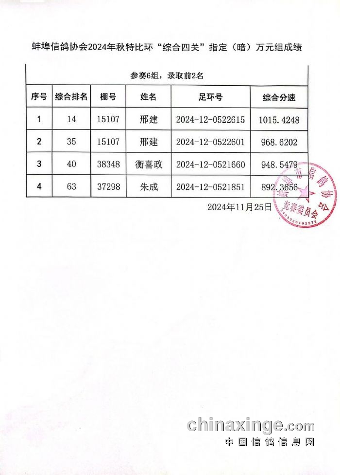 蚌埠市信鸽协会2024年秋季特比环四关综合万元组指定(暗)成绩