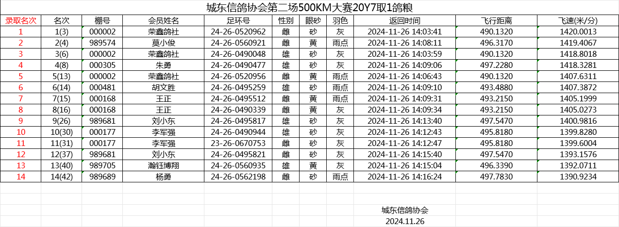 城东信鸽协会第二场500KM大赛20Y7取1鸽粮.
