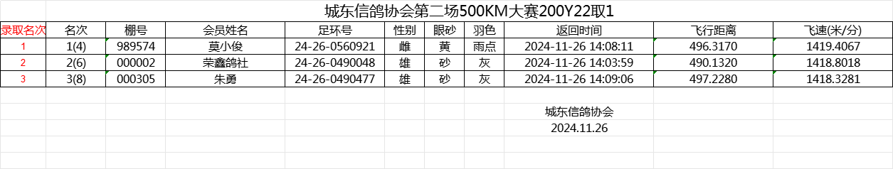 城东信鸽协会第二场500KM大赛200Y22取1